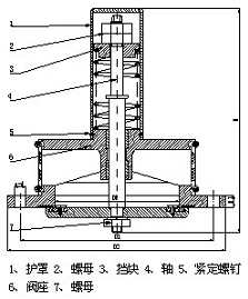 用螺絲刀旋開(kāi)序號(hào)5的兩個(gè)緊定螺釘,拆開(kāi)序號(hào)1護(hù)罩,按開(kāi)啟真空度要求,固定序號(hào)4軸,松開(kāi)序號(hào)2螺母,調(diào)整好擋塊,調(diào)完畢并緊定序號(hào)2螺母,蓋上序號(hào)1護(hù)罩,鎖緊序號(hào)5的兩個(gè)緊定螺釘。彈簧作用力在真空為5-10KPa時(shí)即能打開(kāi),當(dāng)真空值超過(guò)20-30KPa時(shí)閥門全開(kāi),當(dāng)閥門下部有水,靠水的浮力自動(dòng)關(guān)閉。